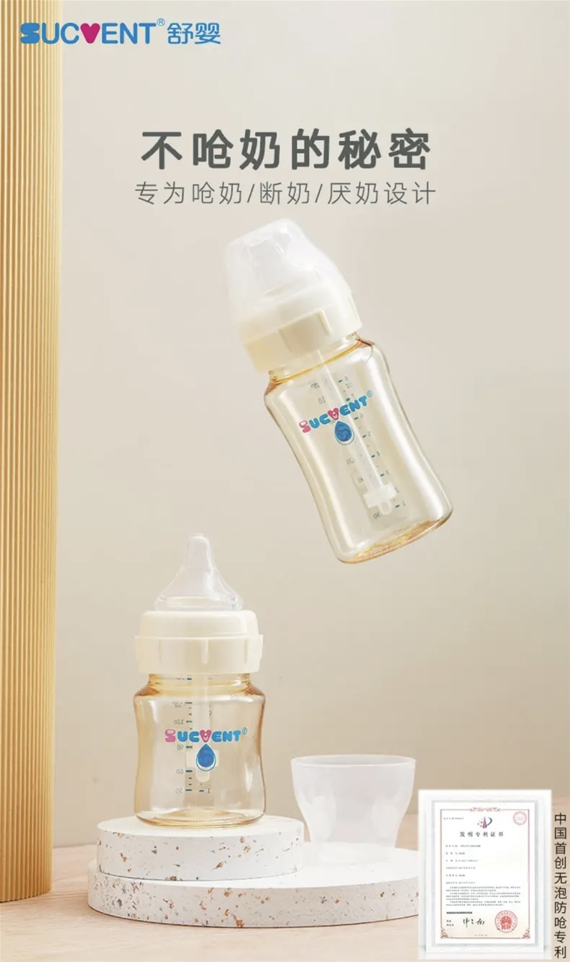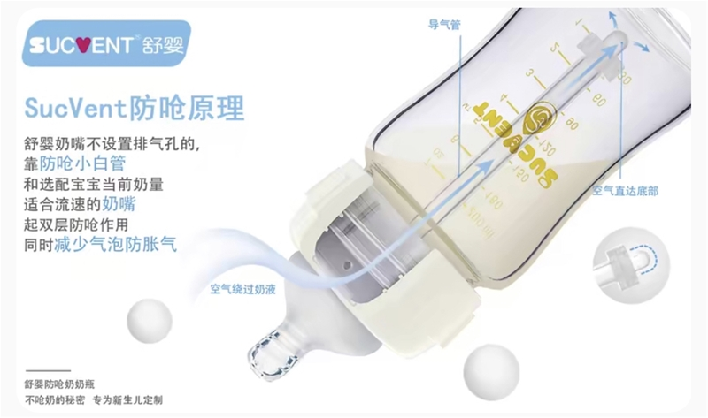 ②防胀气和流速控制: 宝宝呛奶情况大多由于奶瓶流速不稳定、饮奶过程中吞入空气等导致,为解决这一核心问题,舒婴特创“防呛小白管”奶瓶,采用第五代智能恒压实现科学仿生喂养。舒婴新生儿防呛奶瓶融合VRS枫叶管和ASF自动断流技术,保持瓶内外压力一致,流速稳定,实现按需出奶,随吸随停,在宝宝停止吸吮的时候,奶液不会继续流出,有效防止宝宝呛奶或胀气问题;在喂养过程中,空气由奶瓶螺旋盖进入恒压导气管直达瓶底,轻松实现气液分离,保留奶液营养。 2. 正确喂养姿势 ①抱姿: 自然倾斜抱姿:将宝宝自然地倾斜抱在怀里,让宝宝的头部稍微高过胃部,这样可以减少奶液回流的机会。 45度倾斜:喂奶时,保持奶瓶倾斜45度角,确保奶嘴始终充满奶液,避免宝宝吸入空气。 ②喂奶频率与量: 观察宝宝的需求:根据宝宝的实际需求和反应来调整喂奶量和频率,避免过度喂养导致吐奶。 初为人母的你,选对奶瓶了吗?舒婴愿守护每一个宝宝安心喝奶,快乐成长! |